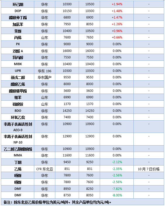 丙烯酸及酯:國內丙烯酸及酯市場在國慶假期前后呈現(xiàn)較大程度漲幅,主要原因為節(jié)后生產企業(yè)在成本面以及國際油價維持漲勢情況下報盤調漲趨勢明顯,另外供應端物流及現(xiàn)貨交付速度恢復偏緩,現(xiàn)貨新單價格上報盤以推漲高端為目標。市場貿易商謹慎跟進,10月8日部分低端價格報盤逐步消失,貿易商捂盤觀望為主,下游工廠消化積累庫存,接單推進成交速度平平。因此10月8日丙烯酸現(xiàn)貨新單報盤價格參考8000-8200元/噸附近,高端報價達8500元/噸暫無成交;丙烯酸丁酯現(xiàn)貨新單報盤價格10000-10200元/噸,高端達10500元/噸,高端暫無成交。