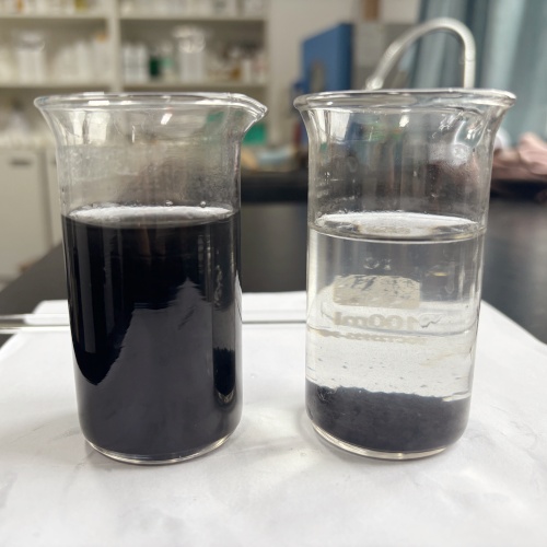 3、結(jié)合客戶要求及廢水水樣的特點,決定使用我司自主研發(fā)生產(chǎn)的漆霧凝聚劑觀察脫色效果。經(jīng)過實驗,脫硫廢水在漆霧凝聚劑的使用下效果顯著。(如下圖)廢水顏色澄清且礬花聚集,而且氣味明顯減弱。